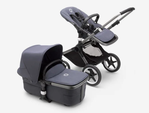 En bas le landeau de la poussette Bugaboo idéal pour un nouveau-né avant de passer au banc de poussette traditionnel.