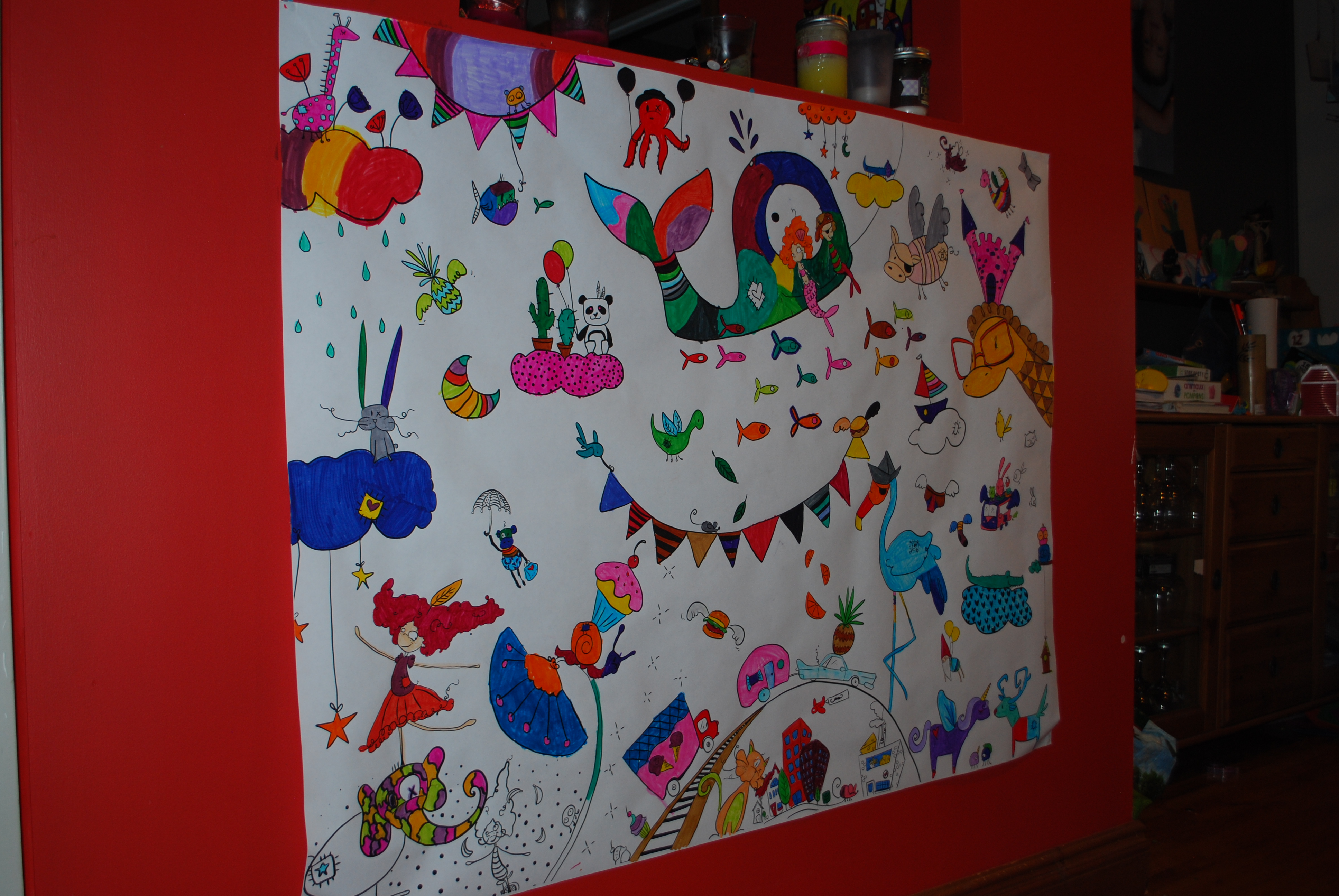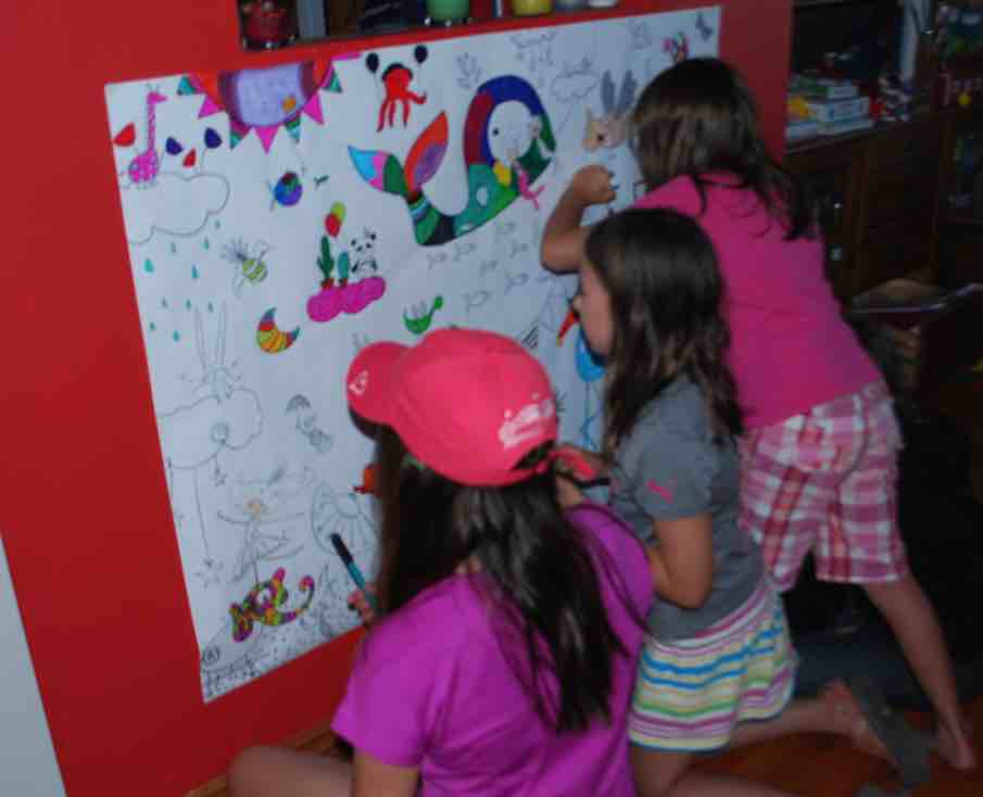 Au départ, ils dessinaient en groupe. Surtout les filles avec les filles et les garçons avec les garçons. Par la suite, le coloriage de l’affiche se réalisait plus lors de transition d’activités. Quand un rentrait de dehors pour prendre une collation ou tout simplement pour se rendre à la salle de bain, il passait devant l’affiche et coloriait un ou deux dessins. À tous les jours, quelqu’un ajoutait un peu de couleur