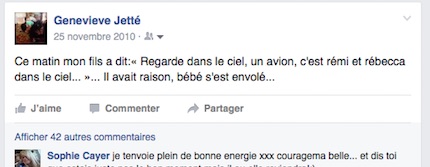 regarde dans le ciel !» Je lui demande : « Tu vois un avion ?», il me répond : «Non maman, c’est Rémi-Rébecca qui est dans le ciel». Le frisson m’a passé dans la colonne comme s’il faisait -1000 tout d’un coup, c’était comme évident, je perdais du sang depuis deux jours en bonne quantité mais je m’accrochais aux forums de mères sur internet pour qui ça c’était bien passé. Je le savais au fond de moi que c’était terminé, ça se sent ces affaires-là. Couchée sur le lit frette du département des échographies, l’infirmière passait son gugusse frette avec son gel frette sur mon ventre, elle est sortie sans parler avec sa face frette pour laisser la place au docteur qui est entré en faisant la même manipulation. Il m’a regardé en me disant : « La grossesse est effectivement terminée. ». J’ai dit parce que je n’étais pas certaine d’avoir bien compris : « Je n’ai plus de bébé ?». Puis, il m’a dit avec la voix la plus frette du monde : « De toute façon ce n’était pas vraiment un bébé ! ». J’étais sous le choc, il s’est levé, je lui ai demandé ce que je devais faire parce que je n’avais jamais perdu ça moi un pas-vraiment-un-bébé. Il m’a dit d’appeler mon médecin de famille, que ce n’était pas dans son département.